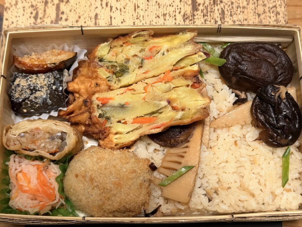 嘉例川で原木栽培された椎茸と筍の煮物、派手ではありませんが添加物不使用で素朴な優しい味のお弁当とのこと。竹籠のお弁当箱がこれまたいい感じ。