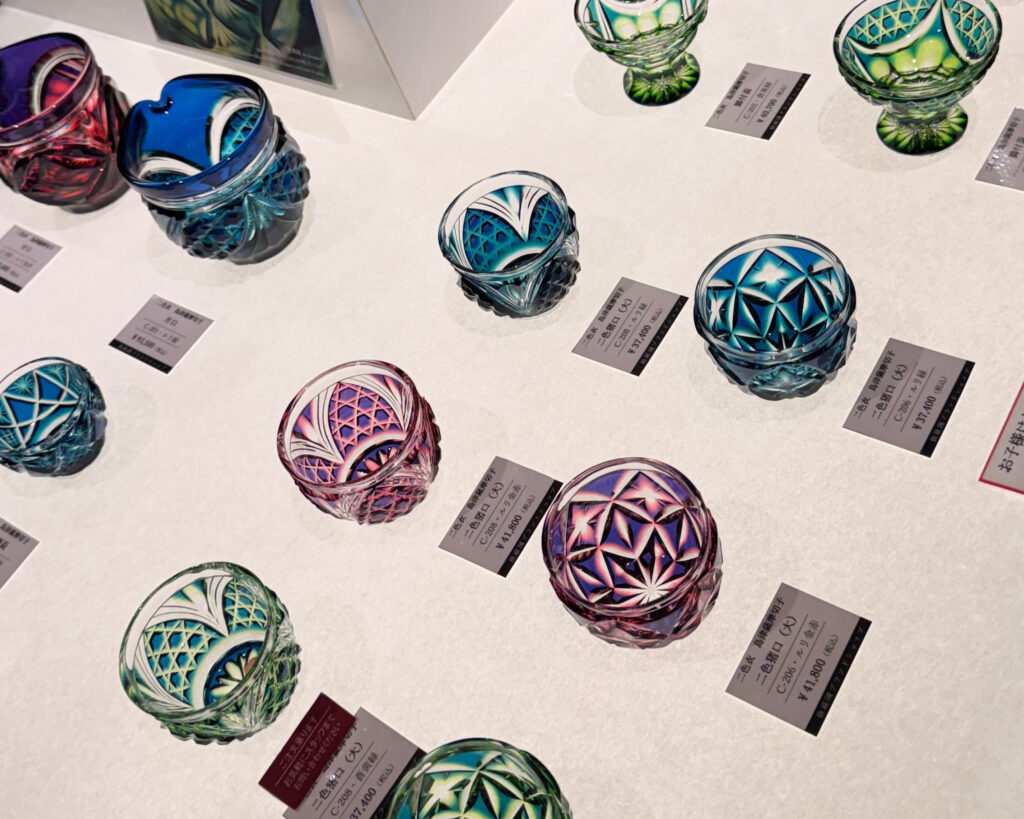 光を浴びて宝石のように輝く切子たち。手作りのため、一つひとつカッティングの深さも、色のグラデーションも、ガラスの厚みも違います。