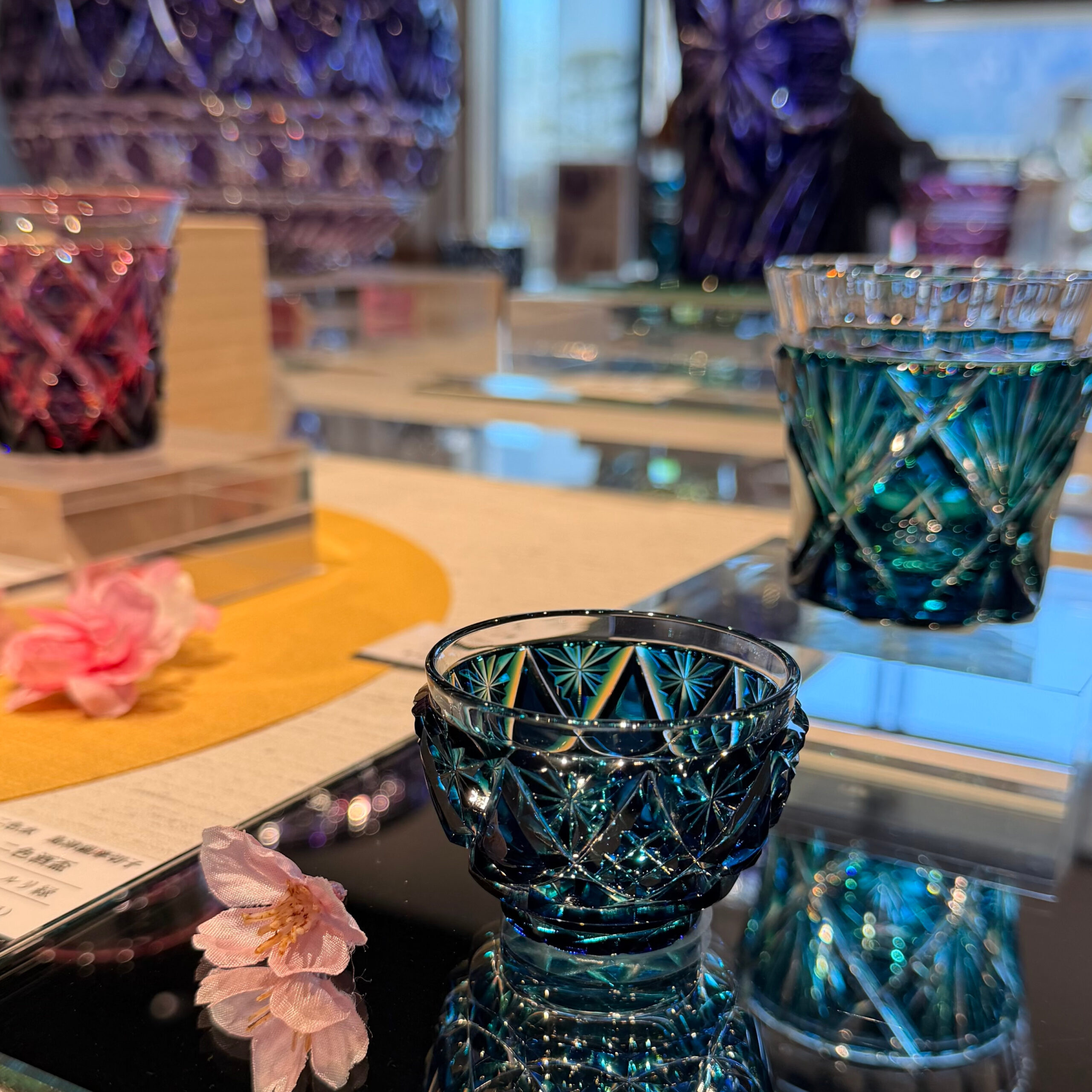 この薩摩切子です!島津薩摩切子のお猪口の赤と二色の瑠璃と緑を買いました👇