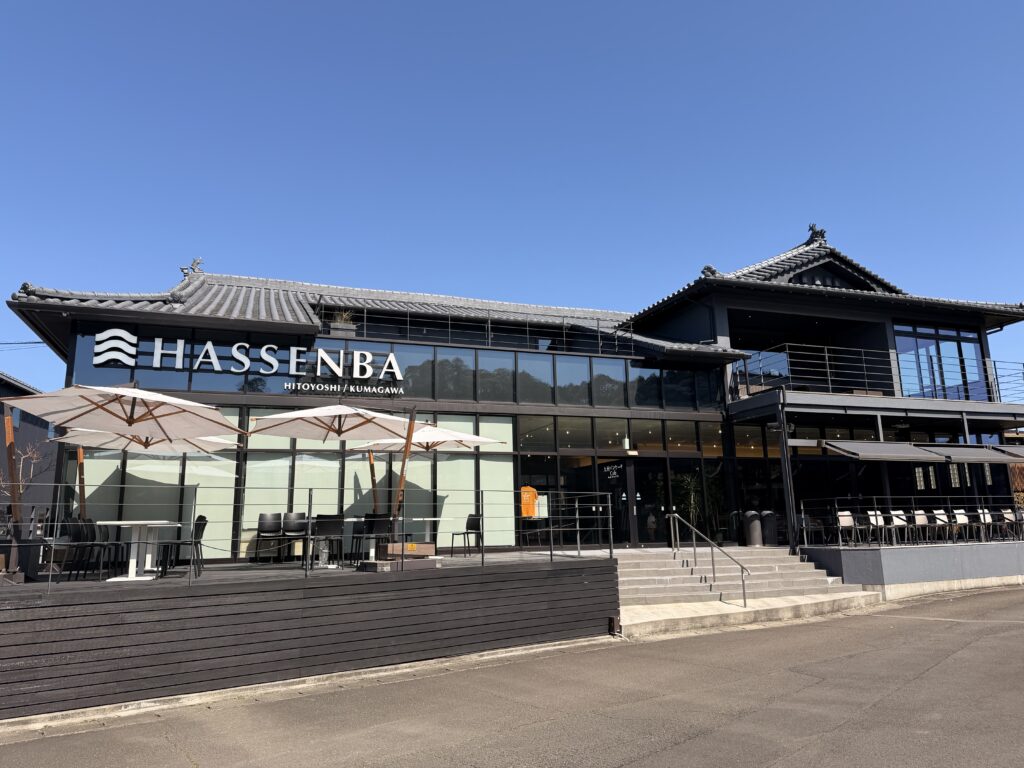 次に向かったのは、球磨川くだりの発着所をリニューアルした複合施設「HASSENBA」。 本来なら「わぁ、素敵!」と駆け出したいほどスタイリッシュな空間なのですが、少々時間が経って怪我に現実味が湧いてきた今の私には一歩一歩が修行のよう。