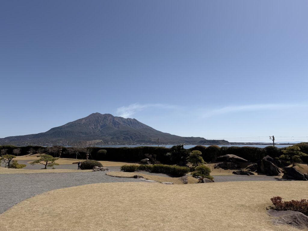 ここは「島津家別邸」。目の前に広がる錦江湾を池に、そびえ立つ桜島を築山に見立てたという雄大な庭園は、まさに殿様しか許されないスケールです。「どこに行けば桜島が綺麗に撮れるかな?」なんて悩みは不要。歩いているすべての場所が、桜島のベストポジションなのです。