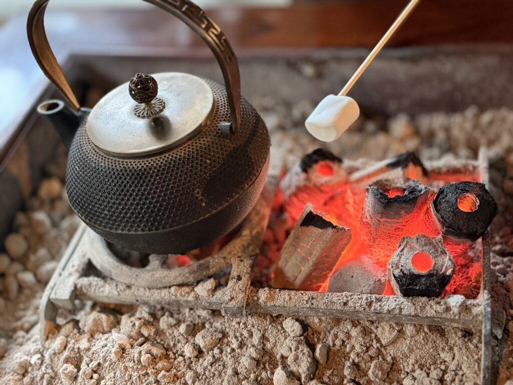 飲泉場の後ろに焼マシュマロ囲炉裏・ふるまい焼酎がありましたので、すかさずマシュマロを1つ口に入れて再度マシュマロ焼きました😇