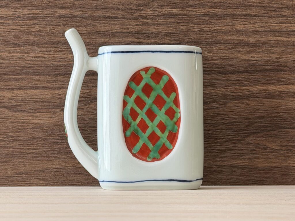 この、どこかレトロでクラシカルなデザイン。ぽってりとした白磁に、温かみのある筆致で描かれた謎の文様。そして、温泉を飲むための独特な形状の飲み口。